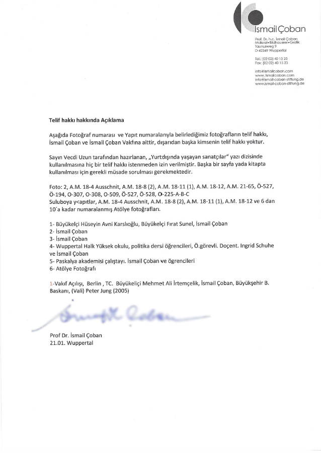 Bu yazısı dizisinde kullanılmak üzere Sanatçı İsmail Çoban ve İsmail Çoban Vakfı tarafından belirtilen yazı ve görsellerin kullanımı, proje danışmanı Vecdi Uzun’a telif hakları kanunları kapsamında izin verilmiştir. Bu kapsamda yayınlanan metin ve görsellerin herhangi bir yayın organında kullanımı izin ve telif haklarına tabidir.