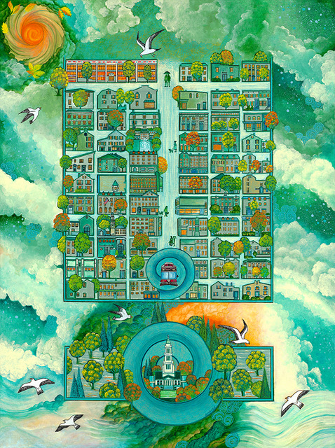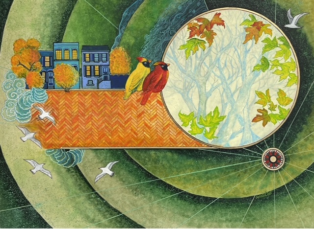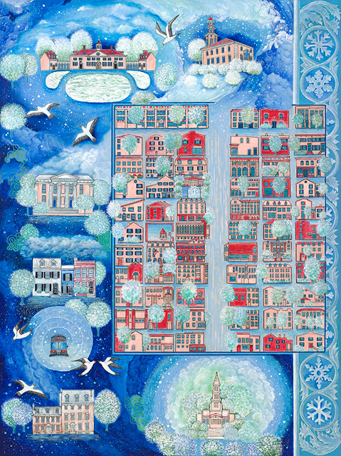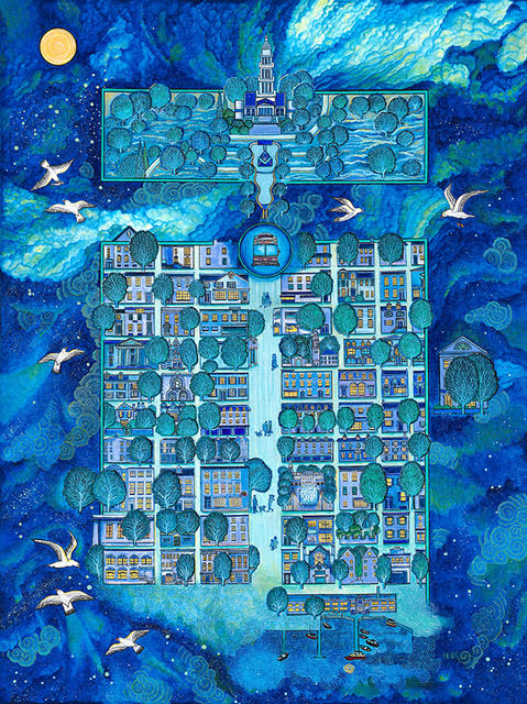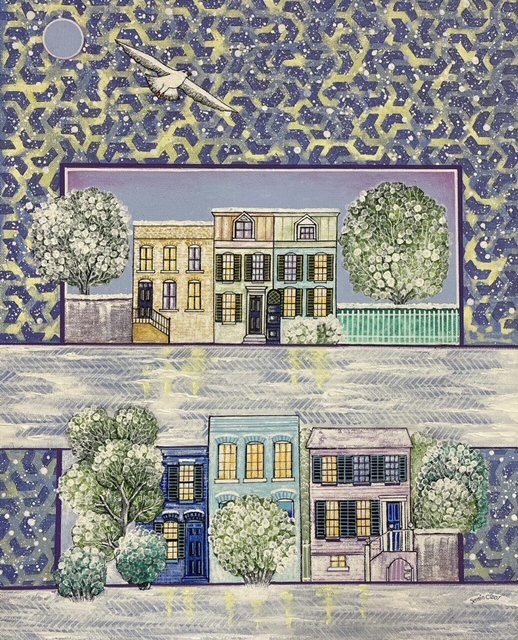 Sermin Ciddi’s keen illustrative skill is rivaled only by her preternatural execution of chromatic interplay. The unimaginable and improbable coexist in the various story-telling comparisons’ use of color. Even a moonlight depiction of the modern-day main streets of Old Town Alexandria, Alexandria in the Moonlight , evokes mystery and magic. Washed in Ciddian blue, viewers search for clues as to what lies behind closed doors and beneath indigo waters illuminated by a moonshine sky.