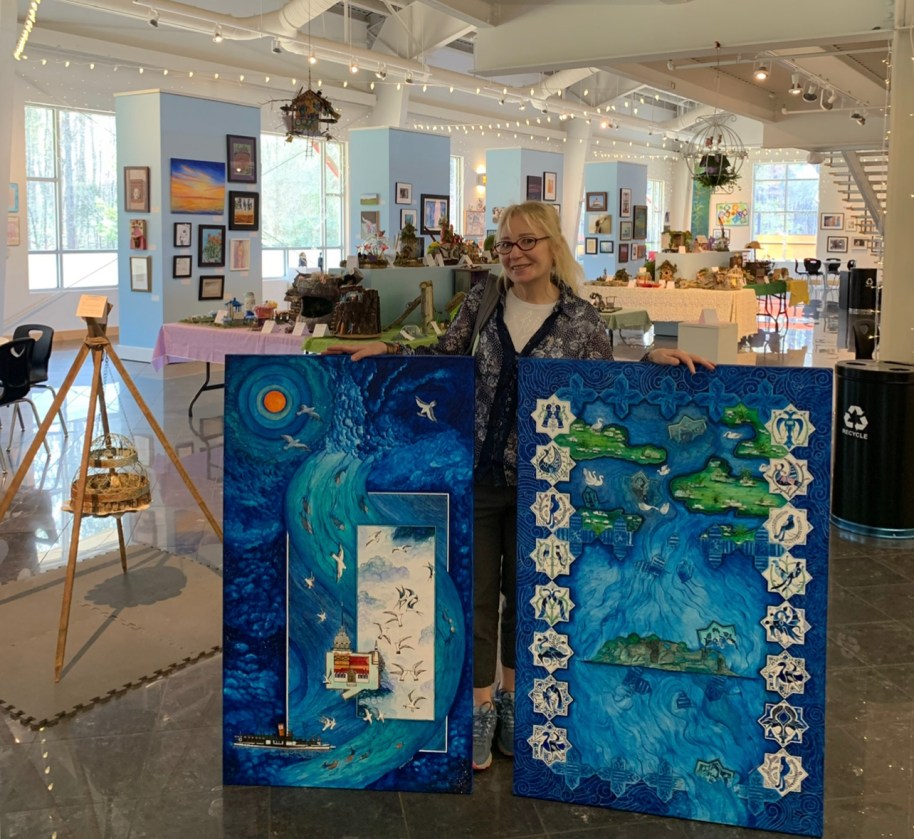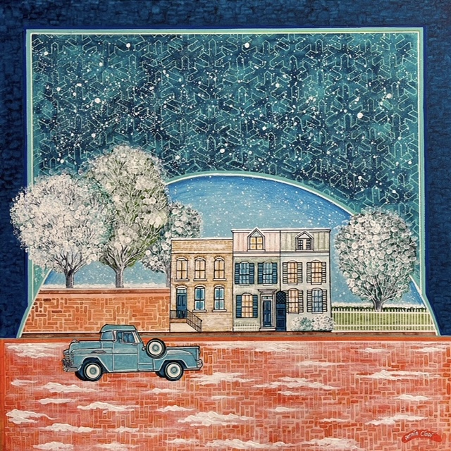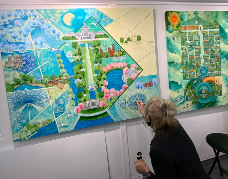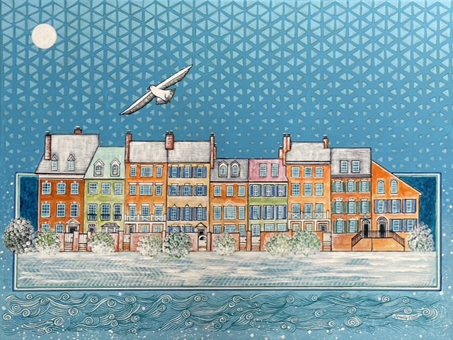 In addition to exhibiting at the Torpedo Factory Art Center, Ciddi‘s artwork has been shown at the Touchstone Gallery in DC. Several images of Ciddi’s art are also represented in the national COVID Hope Quilt and the HOPE Letters project displayed at the Lincoln Memorial and the Jefferson Memorial as well as around the country. She is a recipient of the 2021-2022 Virginia Museum of Fine Arts Fellowship, one of the largest programs of its kind. Alexandria Mayor Justin Wilson has Alexandria in Moonlight proudly hanging in his Old Town City Hall office.