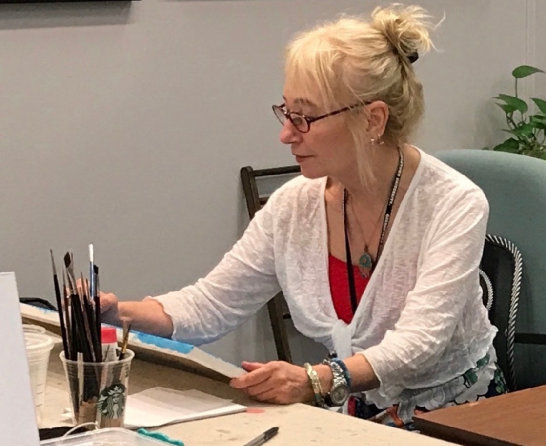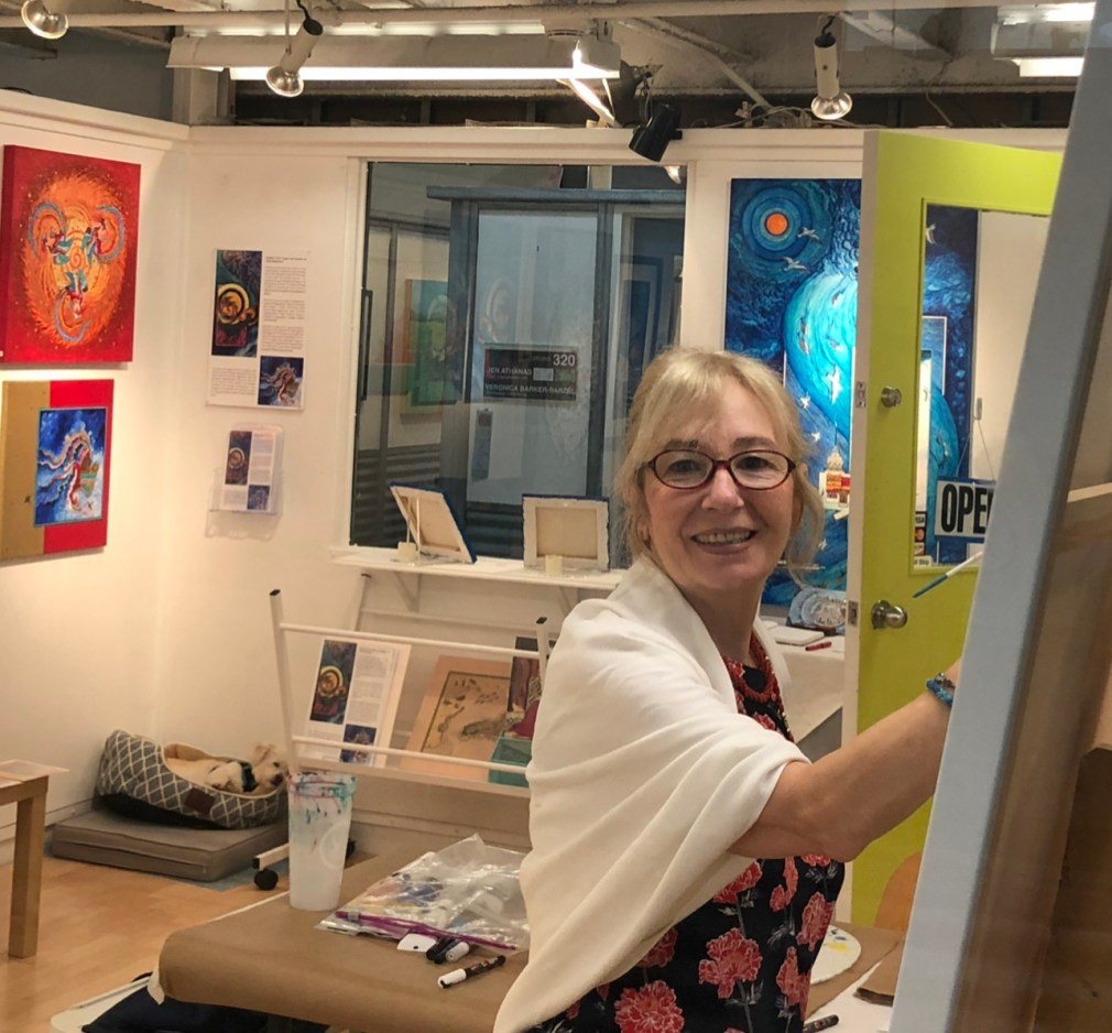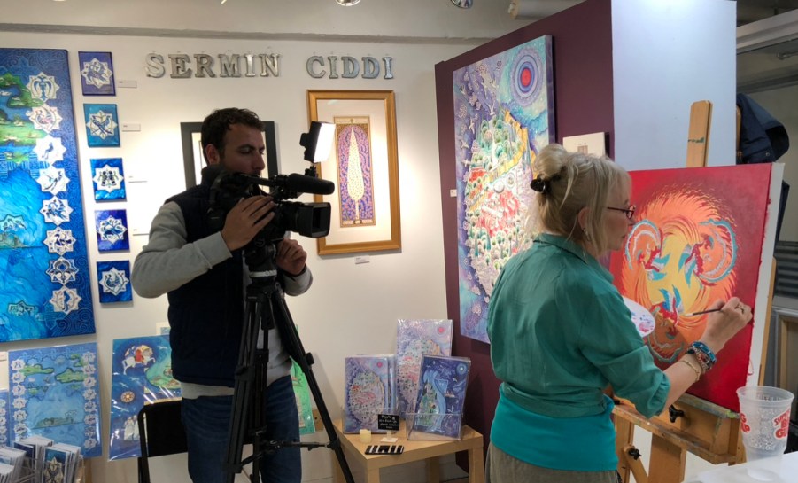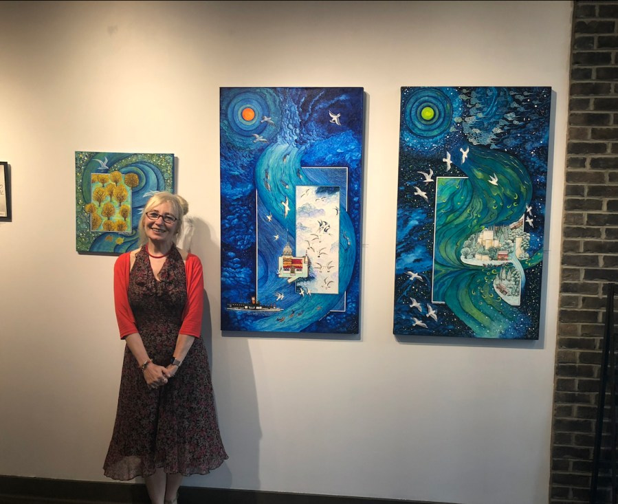Sermin Ciddi’s third-floor studio in Alexandria’s Torpedo Factory Art Center is always alive with activity. One of the most popular artists at the former munitions factory turned art mecca situated dockside on the Potomac River, Ciddi can usually be found working on a new composition while engaging visitors enrapt by the artwork in her studio gallery. Standing guard is her ever-faithful pup companion Dost (meaning friend or pal in Turkish), curled up in the corner with a watchful eye.