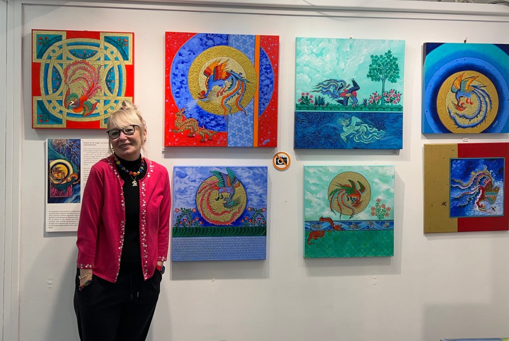 The Maiden’s Tower and Edirne Palace still appear in her work, but now they stand side by side with moonlit depictions of Alexandria’s Old Town and its brick-covered, Colonial streets. She has even pulled in influence from China and beyond with pieces like “Battle in Bloom” that pit the benevolence of the mythical phoenix against the ferocity of a Chinese-inspired dragon.