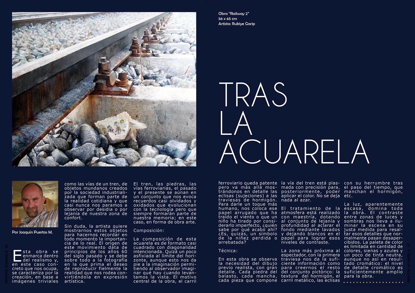 Demiryolu, ancak beton takım taşlarına tespitleri (kısıtlamaları) detaylı bir şekilde göstererek daha da ilerler. İnsanları daha da yakınlaştırmak için, rüzgar tarafından yırtılmış veya bir çocuğun imkansız olarak gördüğü için atılmış bir kağıdı orada bırakır. Kim bilir neden orada kalmış? Belki kaybedilen veya alınan bir çocukluk simgesi midir? Teknik: Bu eserde, gerçekçi ön çizimin gerekliliği, ayrıntılarla birlikte görülür. Tren yolunu oluşturan her taş, her leke, her parça, sonraki renk uygulaması için ölçülerek doğru bir şekilde yansıtılır. Hiçbir şey rasgele bırakılmaz. Atmosferin işlemesi ustalıkla yapılmıştır ve tüm bütünün uzaklık ve derinlik kazandırılmasını sağlar; arka planın açılmasıyla ve kağıdın beyaz bırakılmasıyla kontrast seviyelerini elde etmek için. İzleyiciye en yakın alan, ilk takım taşıyla bize resimdeki tüm bütünün geri kalanını inandırabilecek kadar bilgi verir: betonun yapısı, metal ray, zamanın geçişiyle paslanmış ve betonu lekeleyen kısıtlamalar vb. Görünüşte az ışık, tüm eserin hâkimidir. Aydınlık ve gölge bölgeleri arasındaki kontrast, sahneyi adil bir şekilde aydınlatır ve normal olarak gözden kaçan ayrıntıları vurgular. Renk paleti, renkler, mavi ve mavi tonları ve biraz doğal mürekkep olmak üzere sınırlıdır, ancak kromatik sonuç açısından değil: kromatik ayrıntı seviyesi, eser için yeterince geniştir.