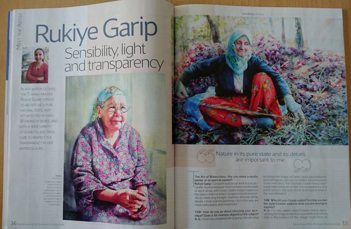 Klasik suluboya tekniklerini kullanan Rukiye Garip, doğal dünyanın unsurlarını gerçekçi ama duygu dolu bir üslupla çevirebiliyor. Doğada güçlü ışık, gölge, doku, atmosfer ve konunun ayrıntılarına sahip sahnelerin fotoğraflarını çekiyor. “Konu hakkında hissettiklerim, öğeler eklemede ve başkalarını dışarıda bırakmada etkili” diyor. “Bazen çizim veya resim aşamalarında duygularıma uymayan olumsuz bir etki gördüğümde istediğim değişiklikleri yapıyorum.” Garip, Bartın’ın küçük bir kasabasında büyüdü ve 4 yaş civarındayken resim yapmaya başladı. Çocukken doğayla çevrili bir ortamda büyüdü ve her resim yaptığında bütün bu parçalarla hatıralarını canlandırdı. “İzleyicilerime iletmek istediğim doğallık, huzur ve sükunet gibi olumlu duygular, çizgilerin ve rengin psikolojik etkileriyle tamamlanıyor” diye açıklıyor. “Tüm çalışmalarıma hakim olan renk ve formlarda görmek istediğim temiz doğaya özlem var. İnsanlara fark edilmeyen güzelliğin değerini, gençliğimizin mutluluğunu, yaşlılığımızı ve tüm anılarımızı hissettirmek